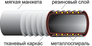 Рукава напорно-всасывающие с текстильным каркасом и металлической спиралью, имеющие на концах мягкие манжеты для присоединения их к арматуре. Применяются для всасывания и нагнетания различных жидкостей.